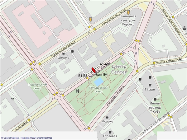 Ленина пл., 9, напротив Кольцовского сквера, справа при движении к ул.Плехановской