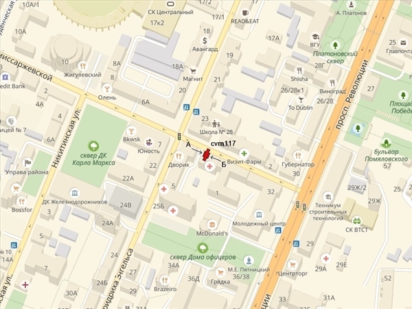 Комисcаржевской ул., 5, в районе пересечения с ул. Ф.Энгельса, справа при движении к пр-ту Революции
