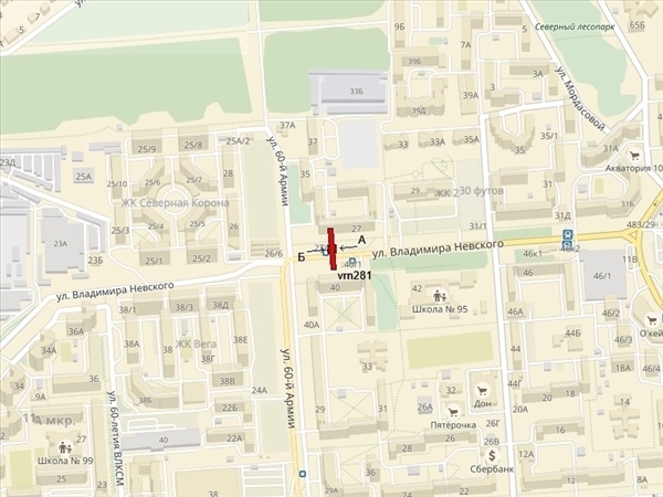 Владимира Невского ул., 27, пересечение с ул.60-й Армии, в районе отеля "Конгресс-отель Бенефит Плаза", справа при движении к бульвару Победы