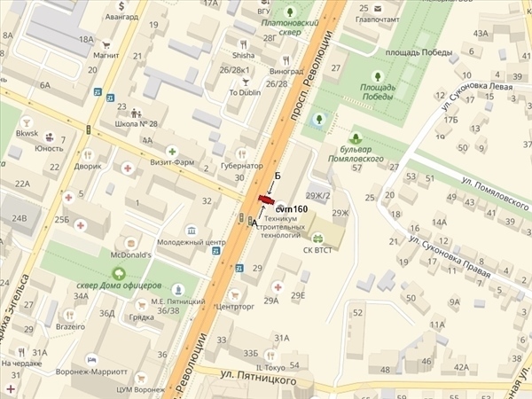 Революции пр-т, 29, за пересечением с ул.Комиссаржевской, у входа в Техникум строительных технологий, справа при движении от пересечения с ул. К.Маркса и Пушкинской