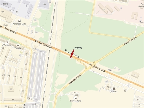 Остужева ул., заезд на путепровод, 100м от пересечения с ул.Минской, справа при движении к Ленинскому пр-ту, сторона Б - выезд из города на Тамбов (трасса М4-Дон), 500м до гипермаркета"Метро"