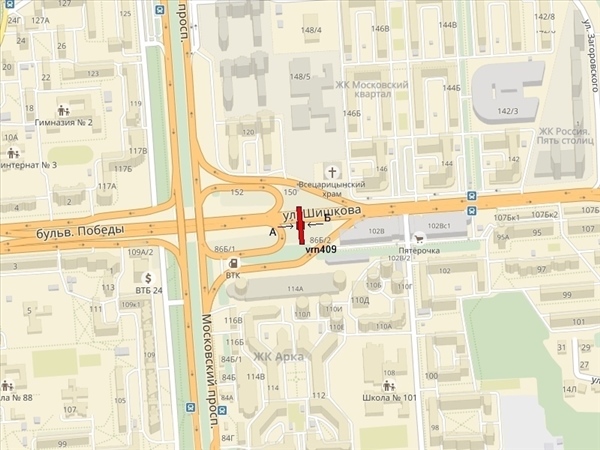Шишкова ул., напротив д.150, справа при движении от Московского пр-та, к гипермаркету "О'кей"