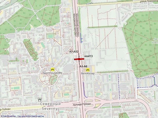 Московский пр-т, напротив д.129/3, разделительная полоса, в районе ТЦ "Московский проспект" и рынка "Воронежский" (стороны А1-А6 - при движении из центра, к ТРЦ "ГРАД" ("АШАН", "Лемана Про") и аэропорту, стороны А7-А12 - при движении в центр)